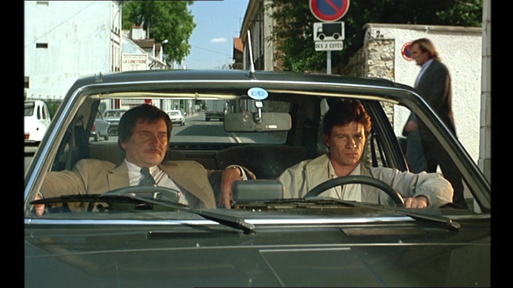 (Scène quand François Pignon et Jean Lucas se stationnement avec une voiture blanche sur le bas-côté du trottoir pour échapper à la police).