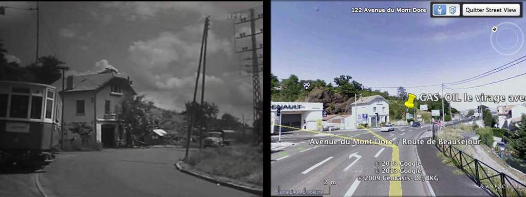 Coord Géo: 45°44'50.59"N, 3°4'14.60"E (45.747387,3.070722) 3) "-Le parapet du pont (en pierre dans le film) métallique aujourd'hui." 4) "La maison aperçue au loin quand le tram se trouve au niveau du pont." 5) "- la maison dans les arbres quand la Vedette fait demi-tour" 6) "- Les deux monts aperçus avec la Vedette" 7) "Le virage où le camion Renault finit dans la ravin: vue de la tour du château de Murol" 8) "Le lieu où la Vedette coupe la route du camion de Jean Chappe. Le bus arrivant en face."