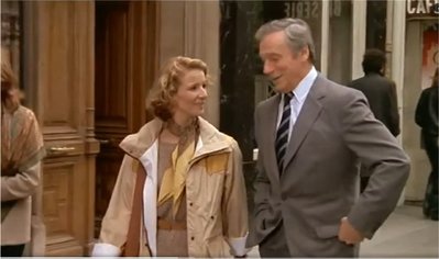 Alex (Yves Montand) et Claire (Nicole Garcia) discutent devant une boulangerie