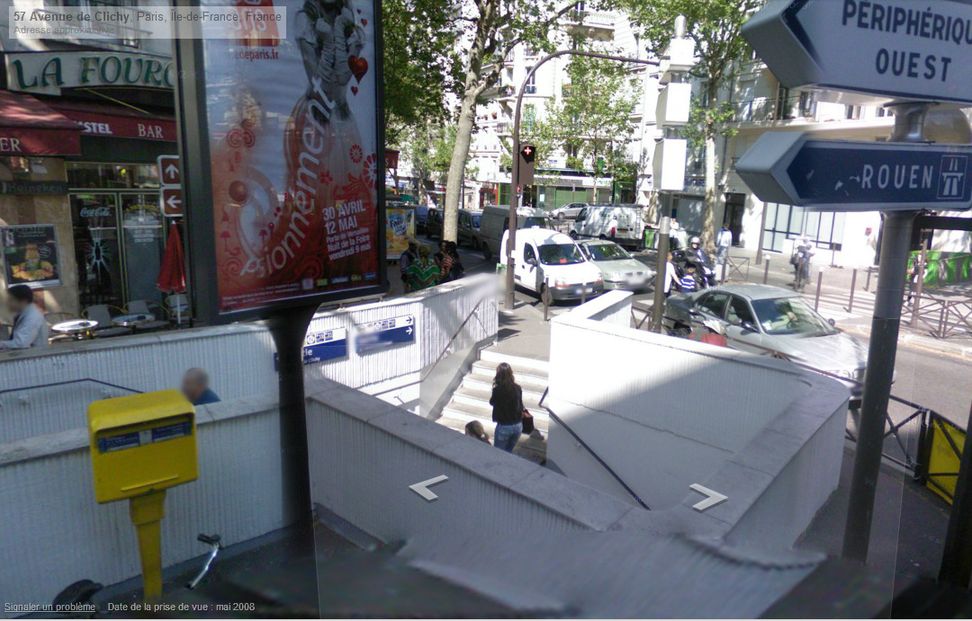 Antoinette, suivie par un « client entreprenant » prend le métro à hauteur du 44 avenue des Champs Elysée. Il s’agit en réalité d’un passage souterrain qui existe toujours. Le métro arrive à la station La Fourche (ligne 13), à l’angle des avenues de Clichy et de Saint-Ouen (18ème) La station a un peu changé, le béton a remplacé le fer forgé, mais l’escalier est le même.