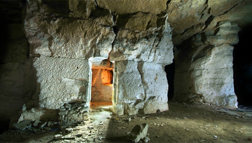 Une carrière ou une grotte et une sorte de tunnel.