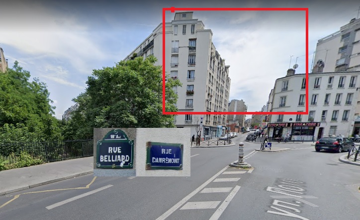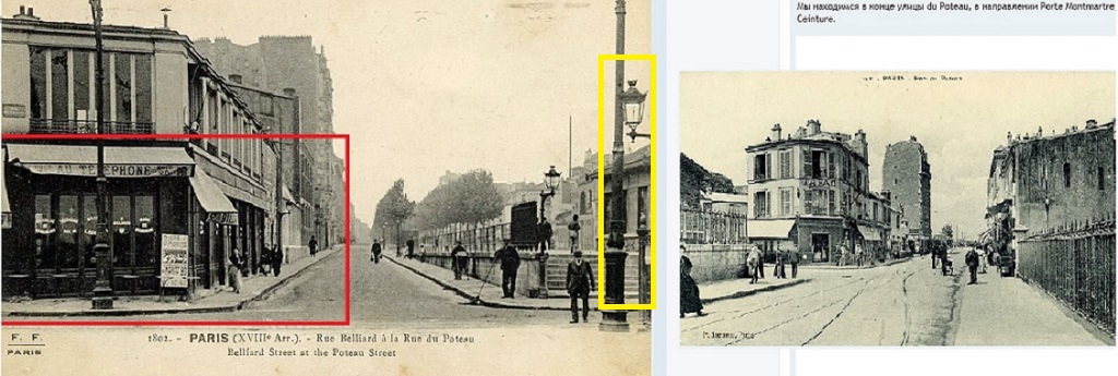 Mais nous pouvons affirmer avec confiance que le coin de la façade de la maison avec des colonnes sur le toit, que les clients voient en entrant dans le café, est situé au 12 rue Gustave Rouanet (75018). Le café lui-même était situé sur la 102-106 rue de Poteau (pour le moment, il n'y a pas de colonnes sur le toit de la maison, mais si regardez l'autre coin de la façade de la maison du côté de rue Vincent Compoint, alors ils sont clairement visibles, mais ici il y a une fenêtre par étage, et dans le film il y a deux fenêtres). C'est à partir de ce point que l'on aperçoit les maisons du boulevard Ney. Quels toits sont dans le film.
