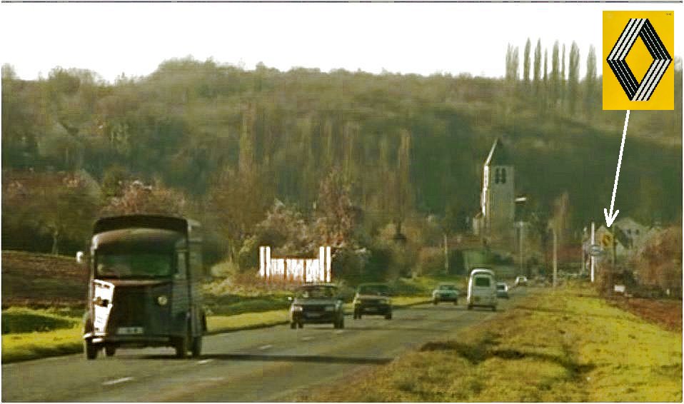 C'est maintenant l'intersection des routes D14 et D73. Une voiture Citroën Type HY descend la D14 en direction de La Souterraine. C'est le 23e département. Le paysage, par endroits, est très similaire au paysage du film. Le panneau routier est probablement réel. En plus de 23 députés, le film a des plaques d'immatriculation 92,93,94,95, 45 et autres. Il y a des épisodes tournés au Havre (76) et à Versailles (78).