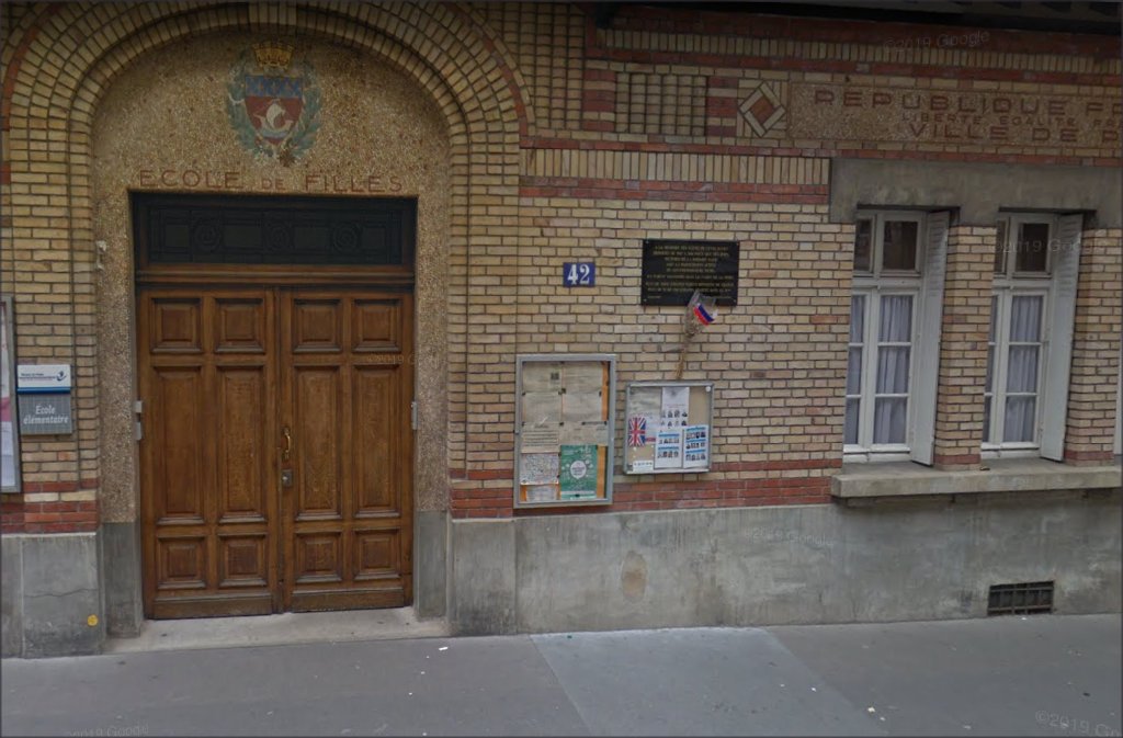 On aperçoit au travers de la vitre une partie de l'école et un bâtiment de briques rouges, 6 rue du jourdain