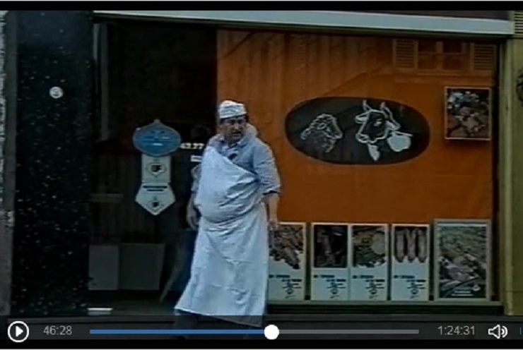 (Scène quand le boucher ferme la porte de son magasin et rentre sous le porche).