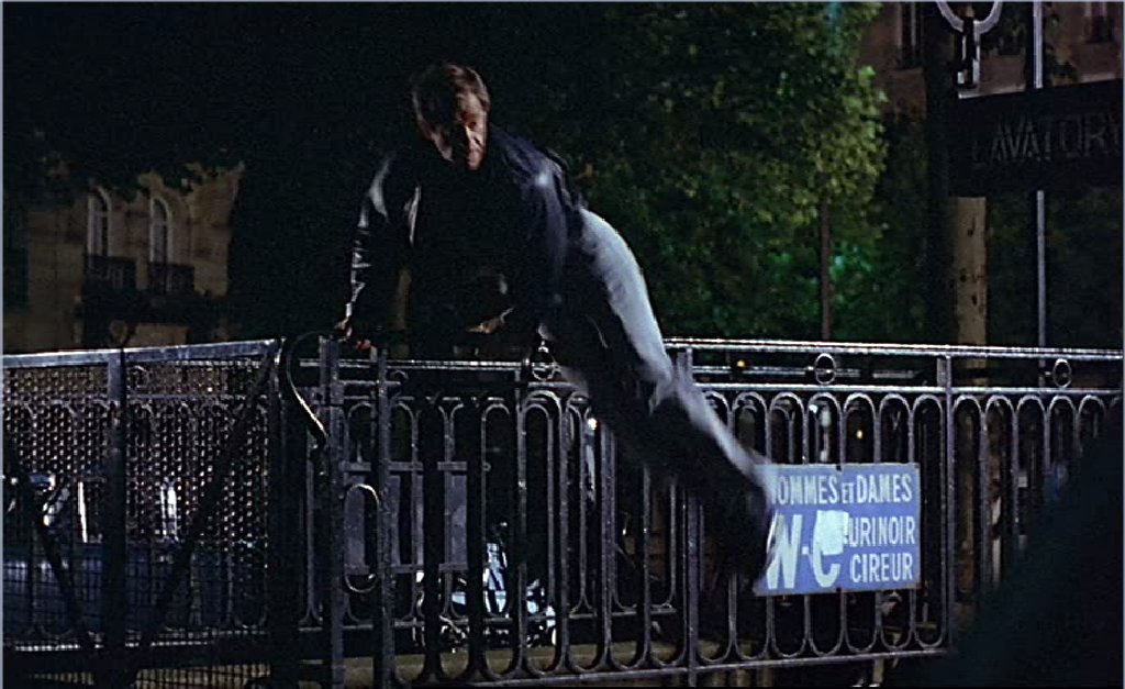 A travers les grilles de l'accès au parking, Beaumont épie le colonel Martin (Jean-Louis Richard) qui se trouve dans un bar avec
