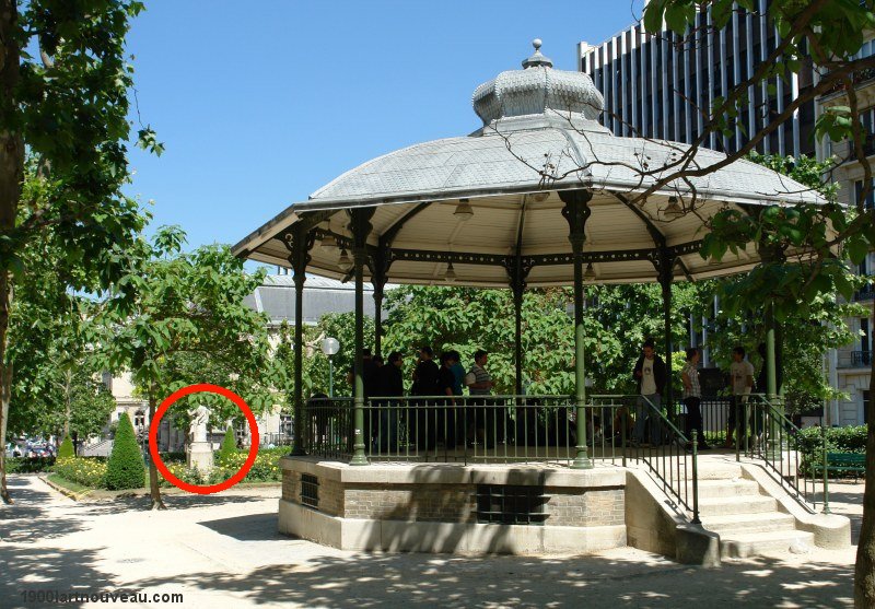 J'arrive après la bataille, mais le puzzle s'assemble parfaitement ; Ce square est bien le même que celui retrouvé par Schauspieler, "Adolphe et Jean Cherioux". Nous avons bien une statue planquée derrière un arbre et un arrière-plan