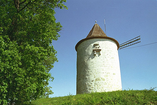 ...ce serait peut-être le moulin de Lartigue, situé en haut d'un butte il a été entièrement restauré et transformé en pigeonnier. A l'origine il avait deux portes au sud et au nord sous les ailes. La porte sud a été murée, au dessus de la porte nord, il y a un sorte d'écusson (serait-ce la tache sombre au dessus de la porte sur la photo du film ???).