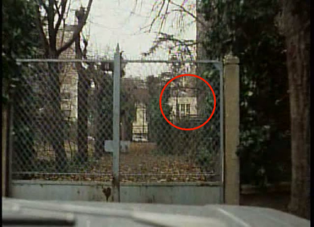 3) quand ils tournent en voiture juste avant l'arrivee on apercoit une facade en brique 23' et a la 13' une statue au fond derriere la voiture vers le portail