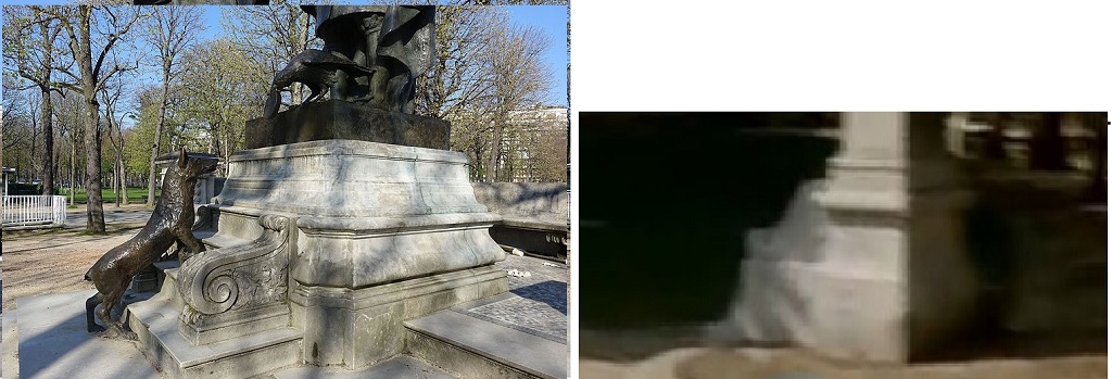 - Pour le chien, je vois aussi les statues et les marches... Là aussi, pour moi, nous sommes dans le Paris des beaux quartiers. Sur la place où s’arrête la 205, ,il y a un autre espace vert..