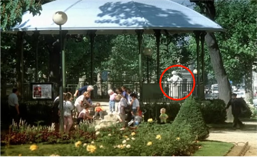 Je viens de voir sur la photo de la stèle qu'il y a si on regarde bien un escalier à droite et peut-être un genre de rampe. Et sur la gauche de bla stèle quelque chose dépasse comme une sculpture. Et j'ai regardé le passage du film je dirai que cette stèle se trouve juste à proximité d'un parc ou jardin public. Des bancs apparaissent sur le côté des arbres gauche. C'est très boisé. Voilà ce que j'ai observé. Si tu peux jeter un œil quand tu le pourras. Je pense bien que cette scène est tournée dans Paris même. Merci à toi. Très bonne soirée!