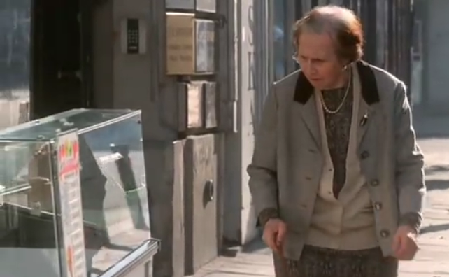 Tatie Danielle qui mange un gâteau et fait une grimace à la vieille dame assise sur l'autre banc.