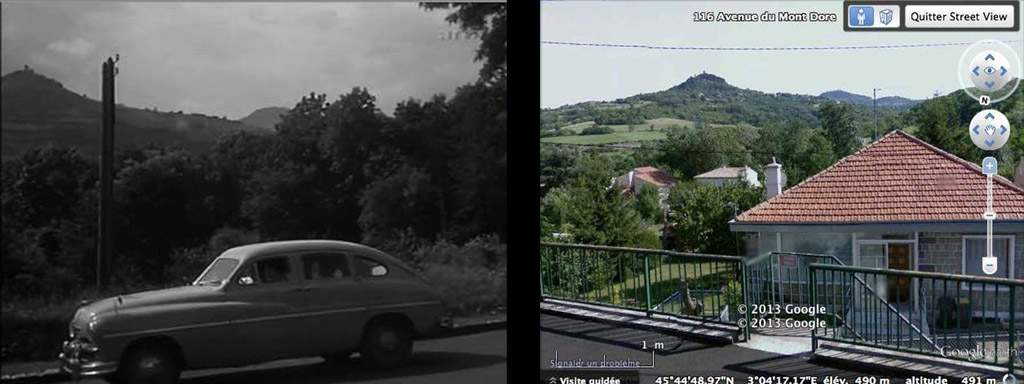 Coord Géo: 45°44'50.59"N, 3°4'14.60"E (45.747387,3.070722) 3) "-Le parapet du pont (en pierre dans le film) métallique aujourd'hui." 4) "La maison aperçue au loin quand le tram se trouve au niveau du pont." 5) "- la maison dans les arbres quand la Vedette fait demi-tour" 6) "- Les deux monts aperçus avec la Vedette" 7) "Le virage où le camion Renault finit dans la ravin: vue de la tour du château de Murol" 8) "Le lieu où la Vedette coupe la route du camion de Jean Chappe. Le bus arrivant en face."